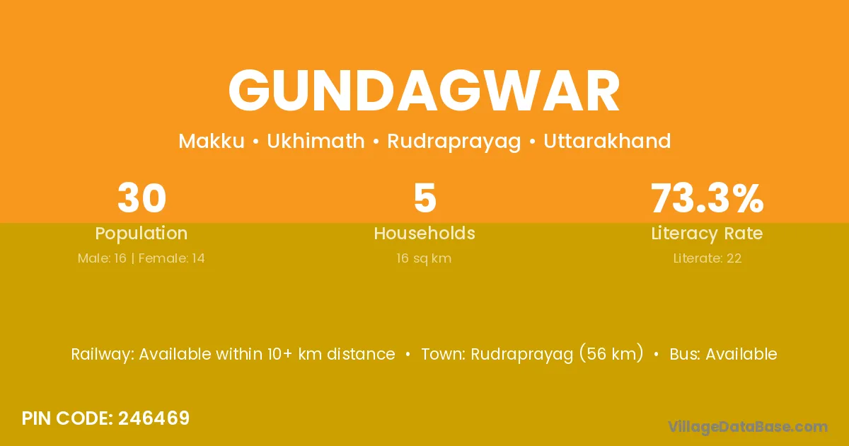 Rudraprayag (56 km) is the nearest town to Gundagwar village for major economic activities and is located approximately 56 km away.