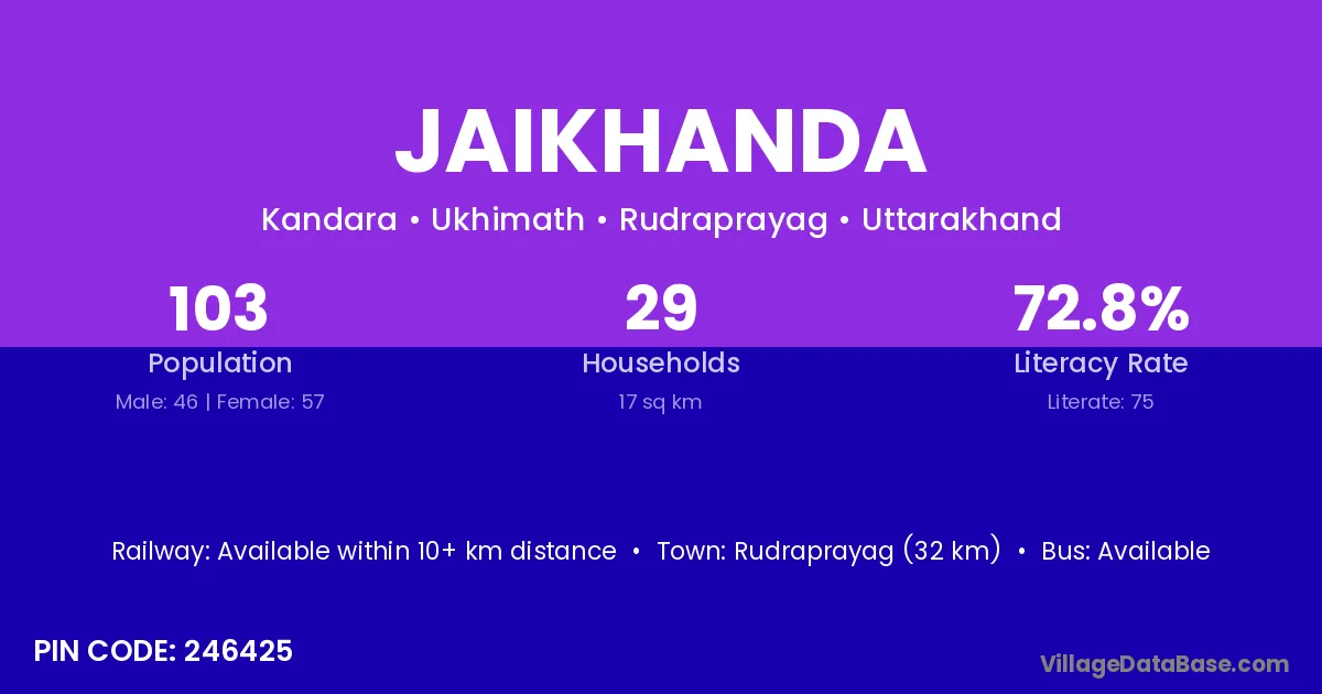 Rudraprayag (32 km) is the nearest town to Jaikhanda village for major economic activities and is located approximately 32 km away.