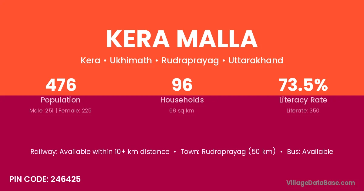 Rudraprayag (50 km) is the nearest town to Kera Malla village for major economic activities and is located approximately 50 km away.