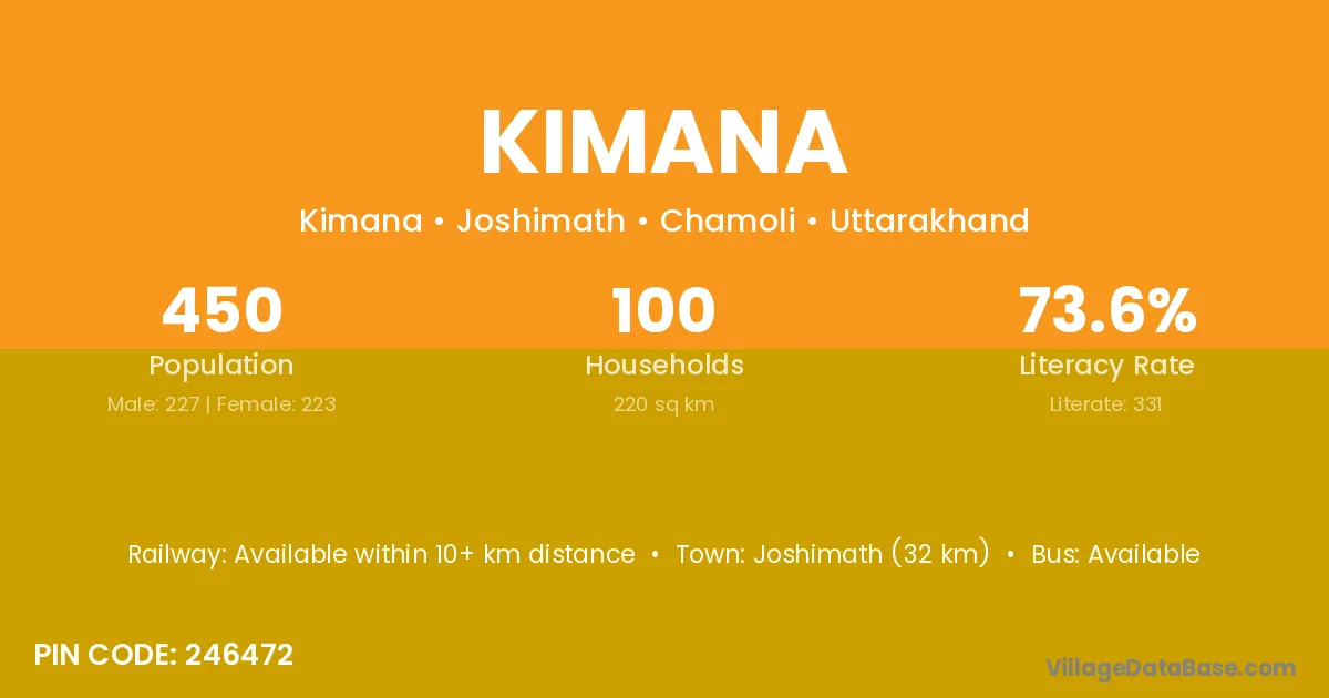 Rudraprayag (45 km) is the nearest town to Kimana village for major economic activities and is located approximately 45 km away.