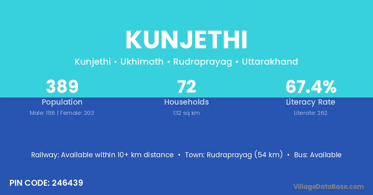 Rudraprayag (54 km) is the nearest town to Kunjethi village for major economic activities and is located approximately 54 km away.