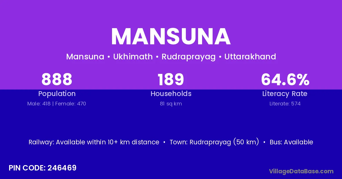 Rudraprayag (50 km) is the nearest town to Mansuna village for major economic activities and is located approximately 50 km away.
