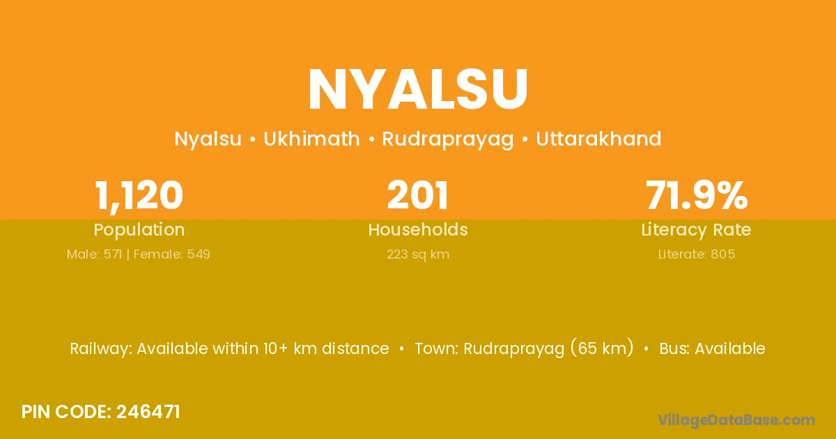 Rudraprayag (65 km) is the nearest town to Nyalsu village for major economic activities and is located approximately 65 km away.