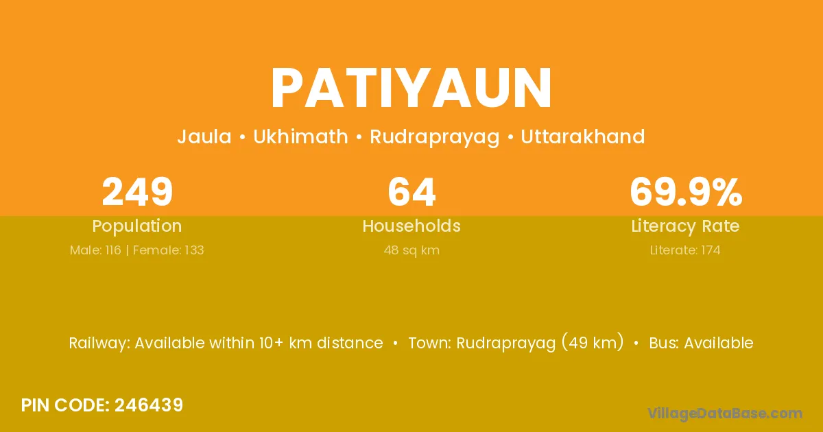 Rudraprayag (49 km) is the nearest town to Patiyaun village for major economic activities and is located approximately 49 km away.