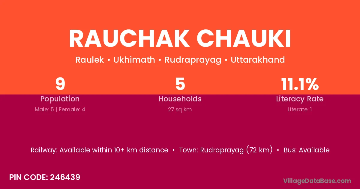 Rudraprayag (72 km) is the nearest town to Rauchak Chauki village for major economic activities and is located approximately 72 km away.
