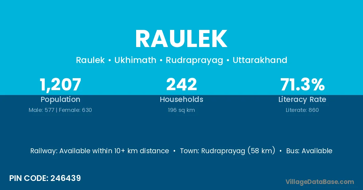 Rudraprayag (58 km) is the nearest town to Raulek village for major economic activities and is located approximately 58 km away.
