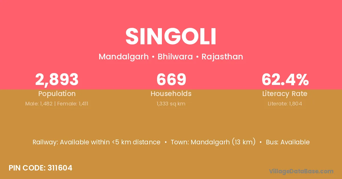 The literacy rate of Singoli village is 76.84%. Male literacy stands at 88.75% and female literacy at 67.01%.
