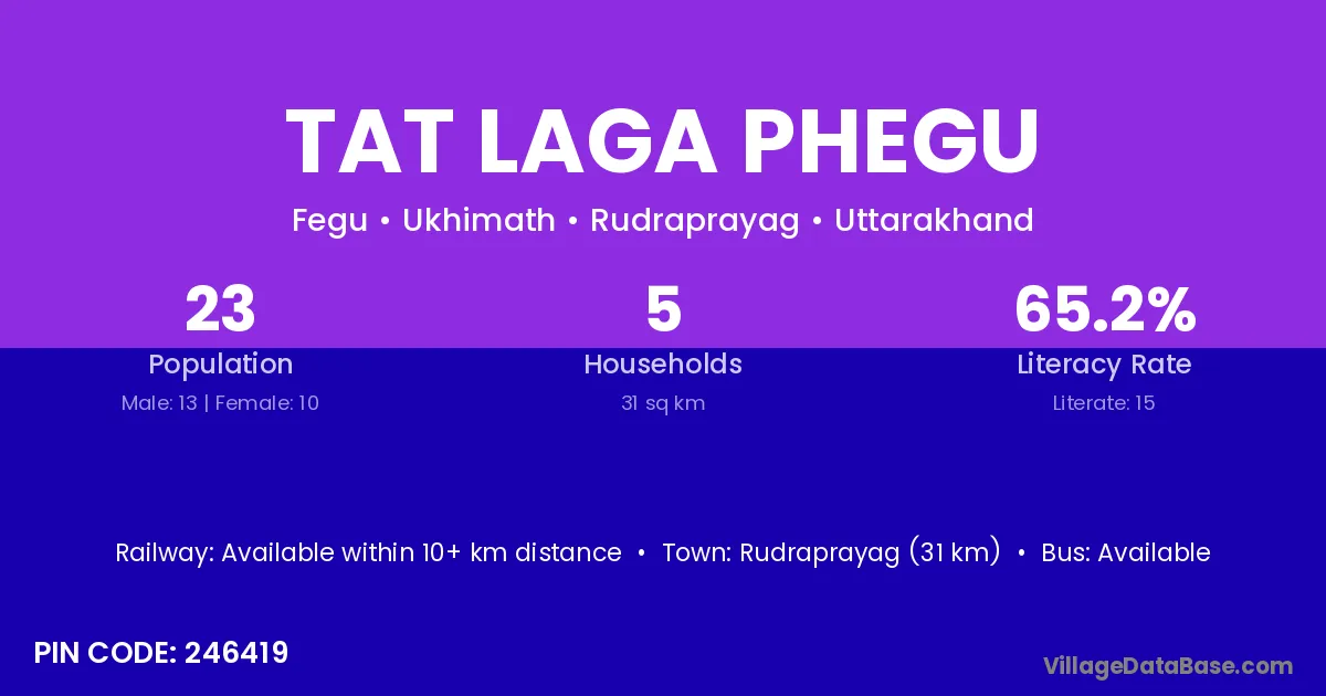 Rudraprayag (31 km) is the nearest town to Tat Laga Phegu village for major economic activities and is located approximately 31 km away.