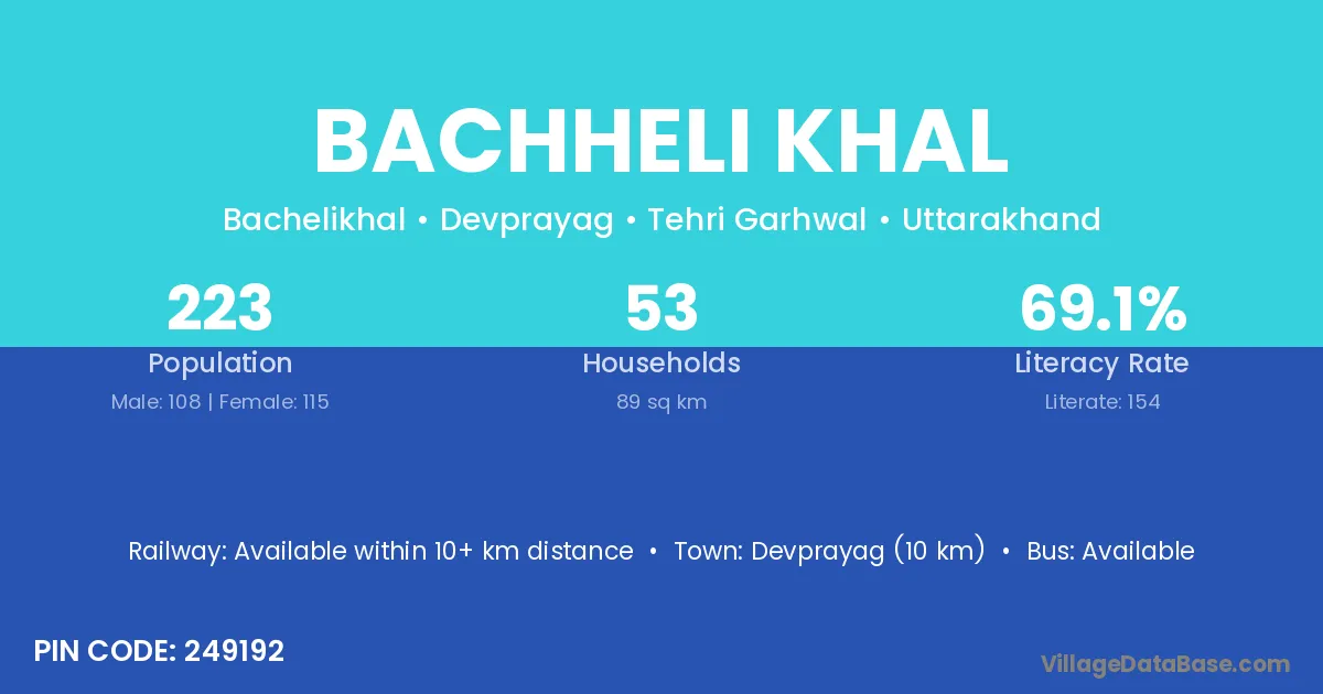 Bachheli Khal village has a total population of 223 people, of which 108 are males and 115 are females.