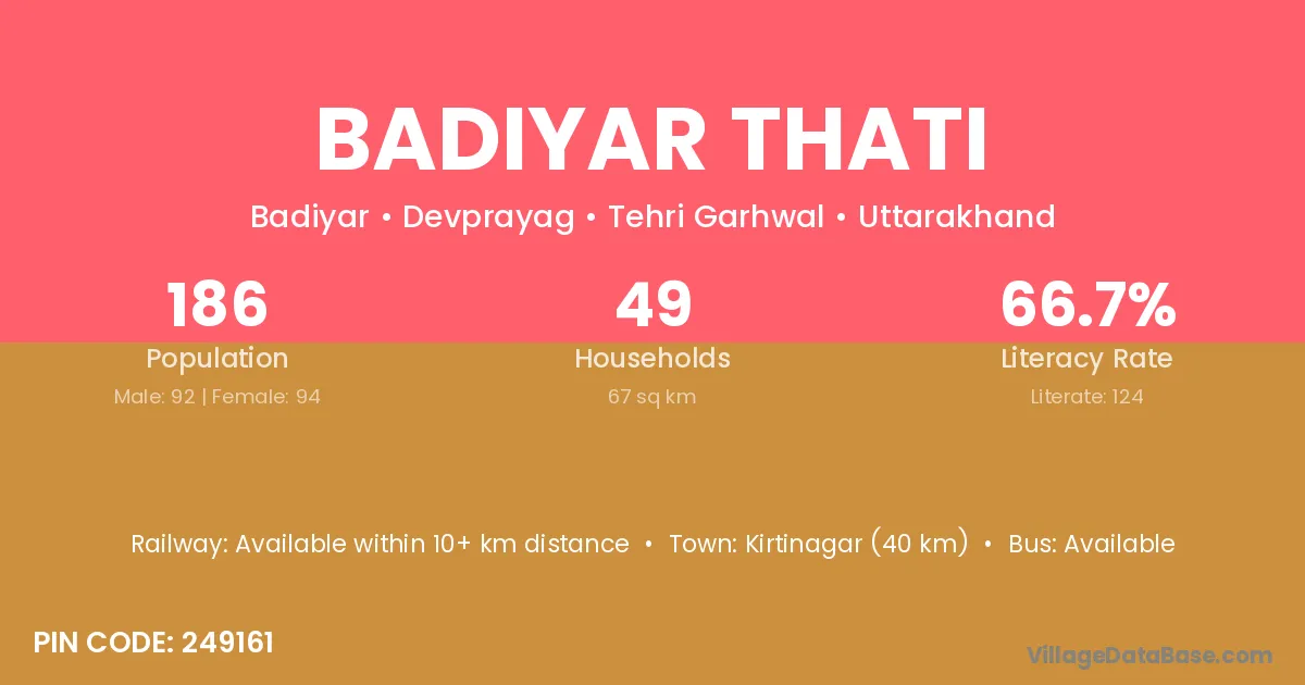 Kirtinagar (40 km) is the nearest town to Badiyar Thati village for major economic activities and is located approximately 40 km away.