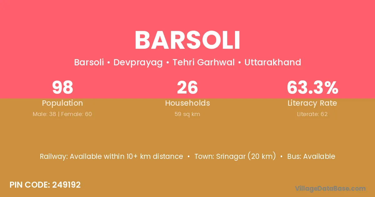 Srinagar (20 km) is the nearest town to Barsoli village for major economic activities and is located approximately 20 km away.