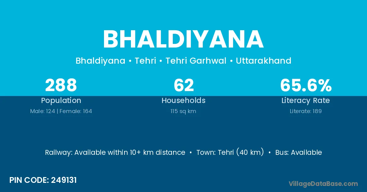 Devprayag (35 km) is the nearest town to Bhaldiyana village for major economic activities and is located approximately 35 km away.