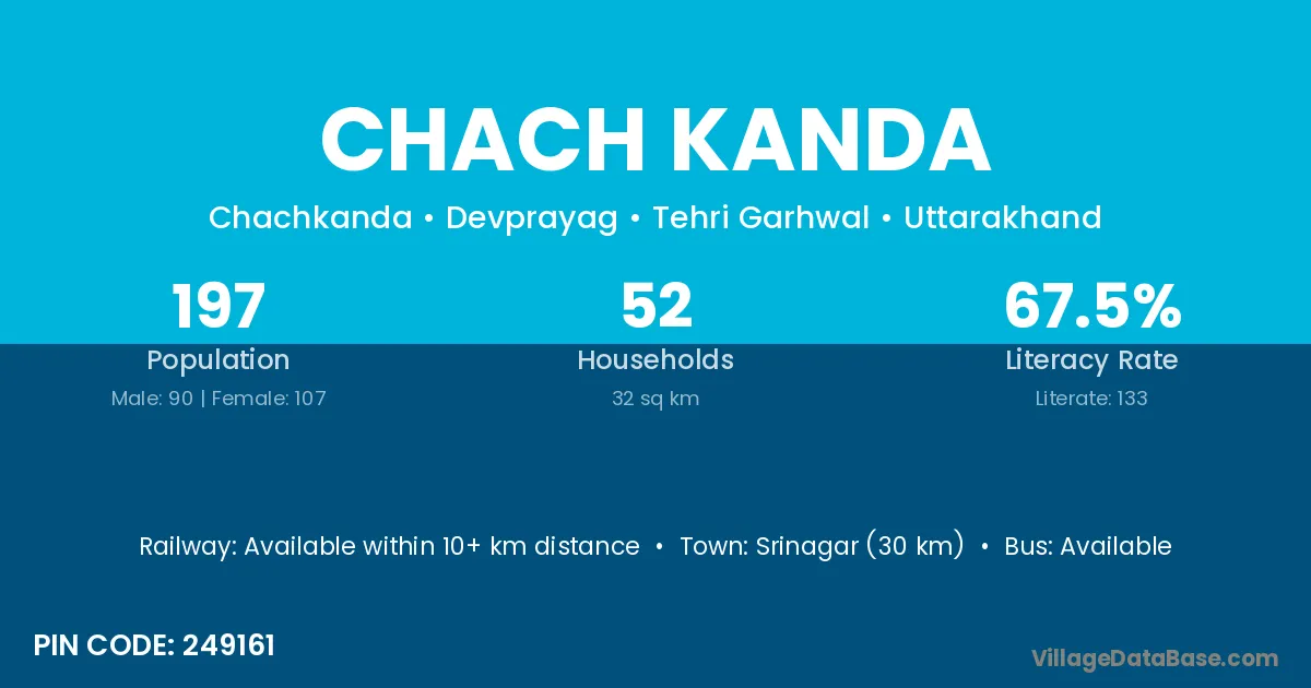 Srinagar (30 km) is the nearest town to Chach Kanda village for major economic activities and is located approximately 30 km away.