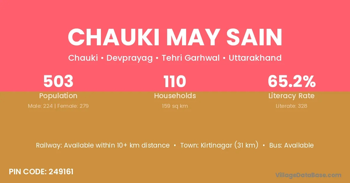 Kirtinagar (31 km) is the nearest town to Chauki May Sain village for major economic activities and is located approximately 31 km away.