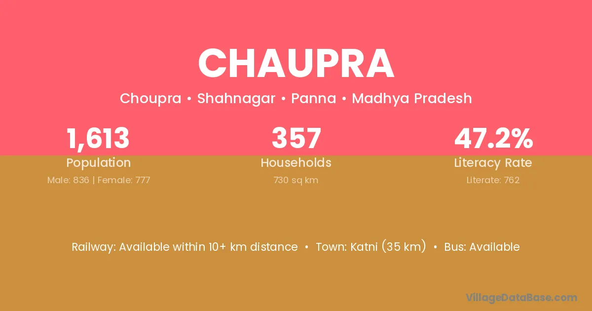The literacy rate of Chaupra village is 69.39%. Male literacy stands at 83.33% and female literacy at 56.00%.
