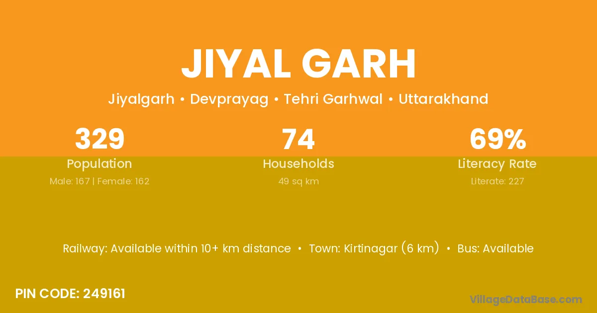 Kirtinagar (6 km) is the nearest town to Jiyal Garh village for major economic activities and is located approximately 6 km away.