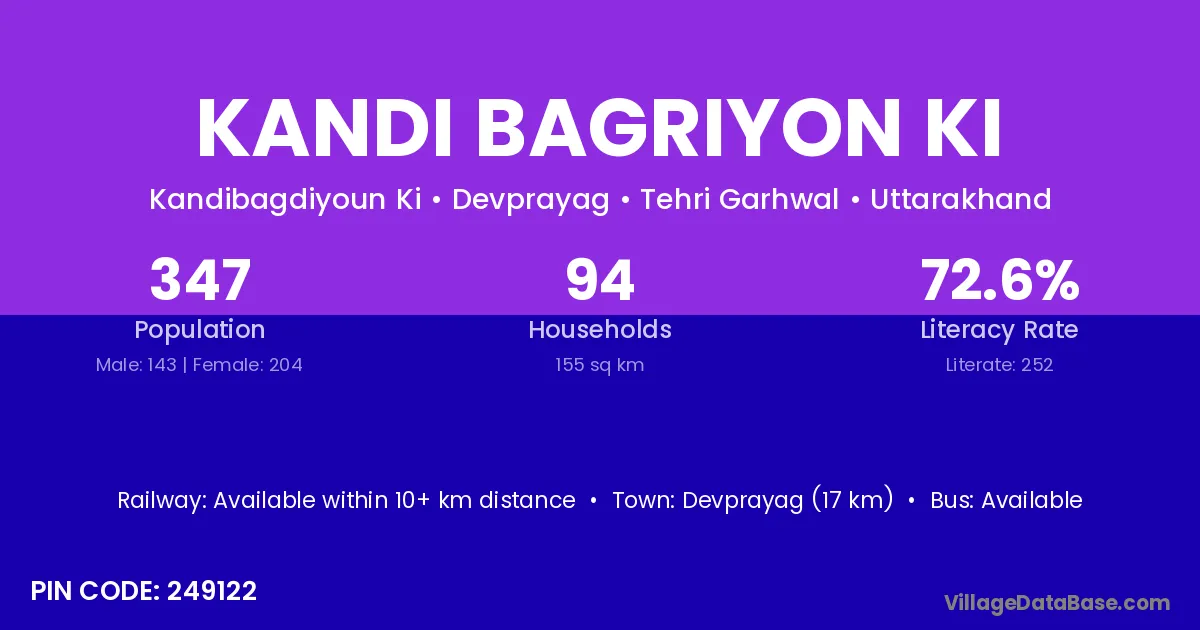 Devprayag (17 km) is the nearest town to Kandi Bagriyon Ki village for major economic activities and is located approximately 17 km away.