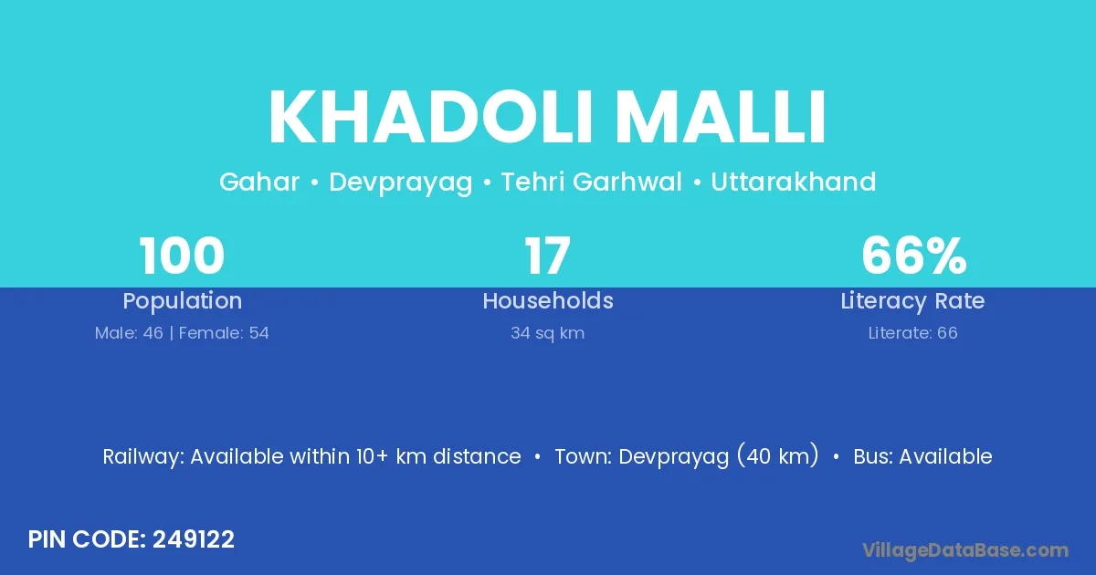 Devprayag (40 km) is the nearest town to Khadoli Malli village for major economic activities and is located approximately 40 km away.