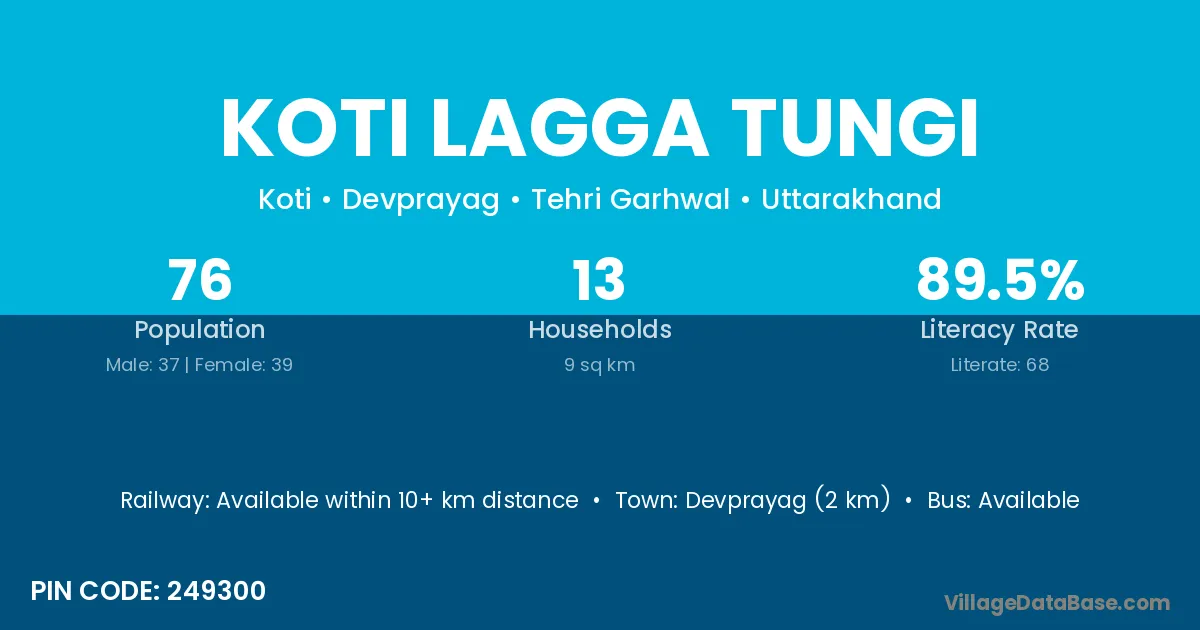 Devprayag (2 km) is the nearest town to Koti Lagga Tungi village for major economic activities and is located approximately 2 km away.