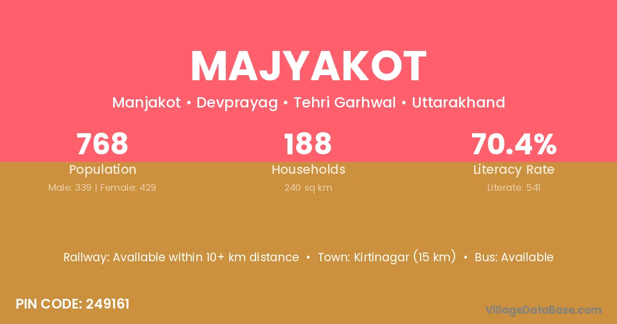 Majyakot village has a total population of 768 people, of which 339 are males and 429 are females.