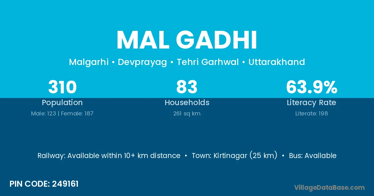 Kirtinagar (25 km) is the nearest town to Mal Gadhi village for major economic activities and is located approximately 25 km away.