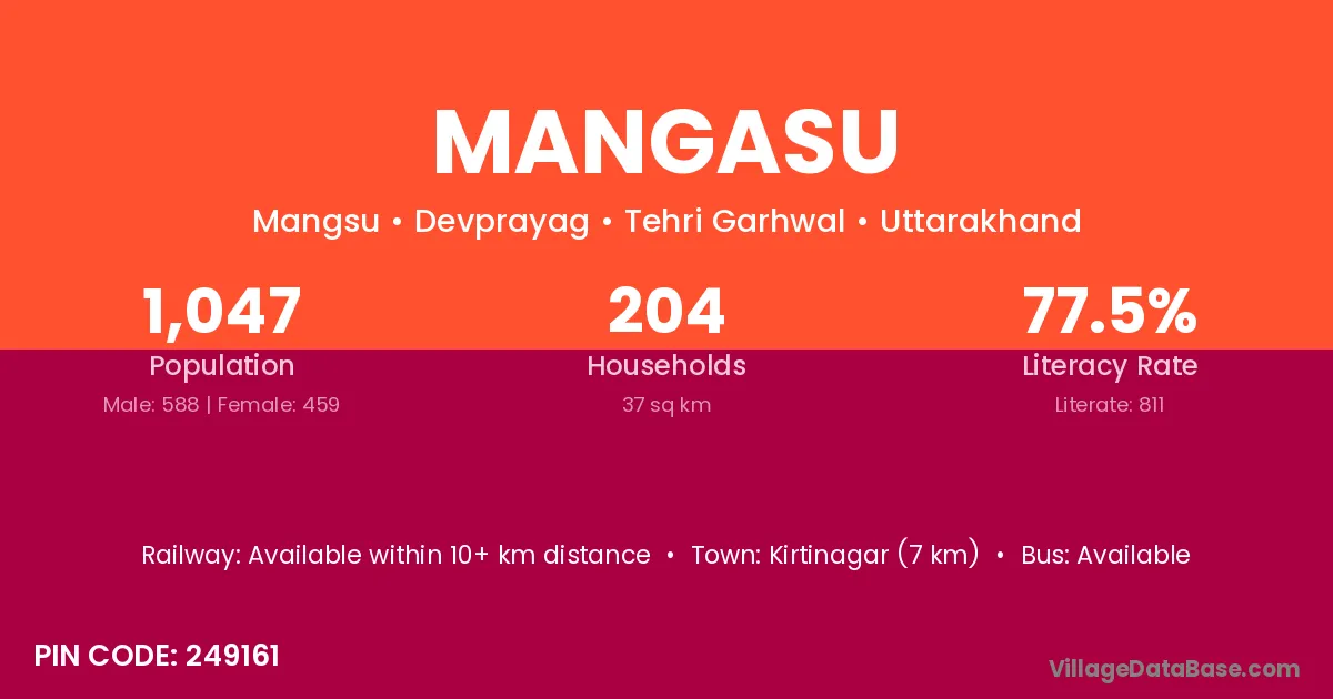 Kirtinagar (7 km) is the nearest town to Mangasu village for major economic activities and is located approximately 7 km away.