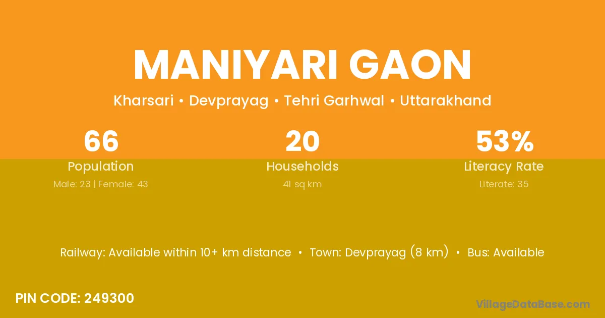 Devprayag (8 km) is the nearest town to Maniyari Gaon village for major economic activities and is located approximately 8 km away.