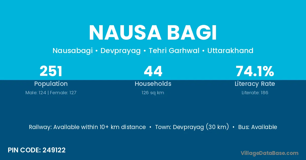 Devprayag (30 km) is the nearest town to Nausa Bagi village for major economic activities and is located approximately 30 km away.