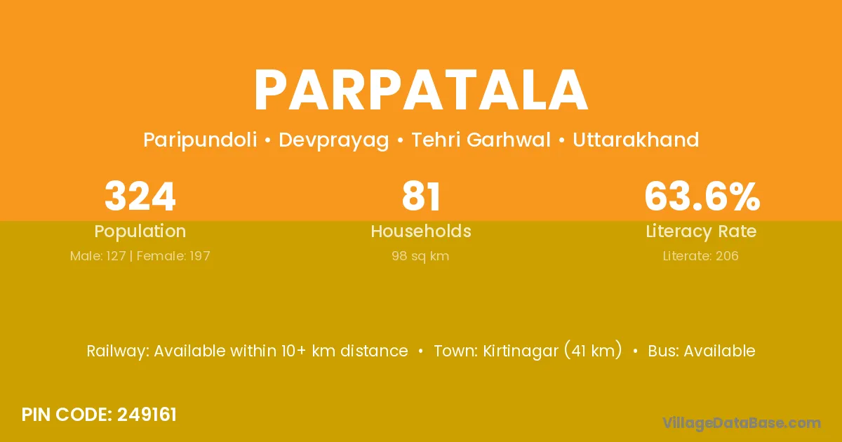 Kirtinagar (41 km) is the nearest town to Parpatala village for major economic activities and is located approximately 41 km away.