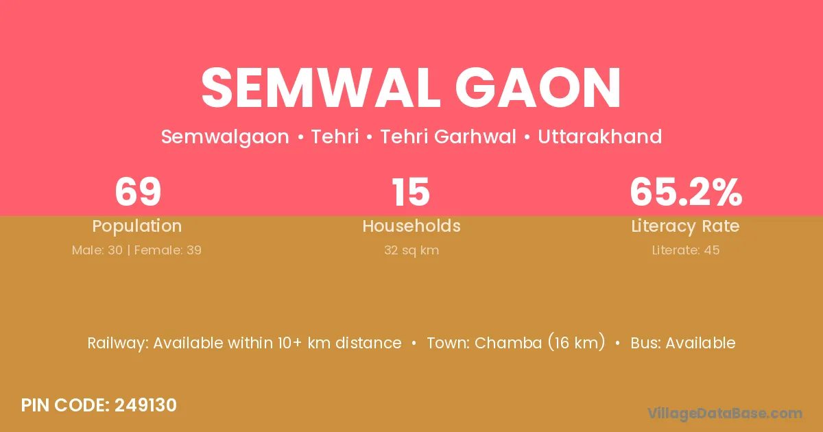 According to Census 2011 information, the village code of Semwal Gaon village is 249161.