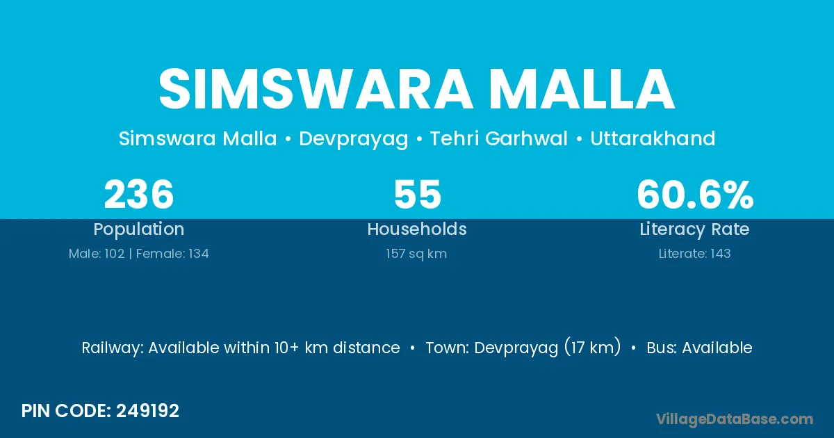 Devprayag (17 km) is the nearest town to Simswara Malla village for major economic activities and is located approximately 17 km away.