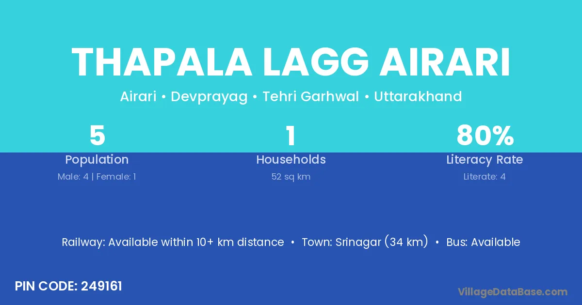 Thapala Lagg Airari village has a total population of 5 people, of which 4 are males and 1 are females.