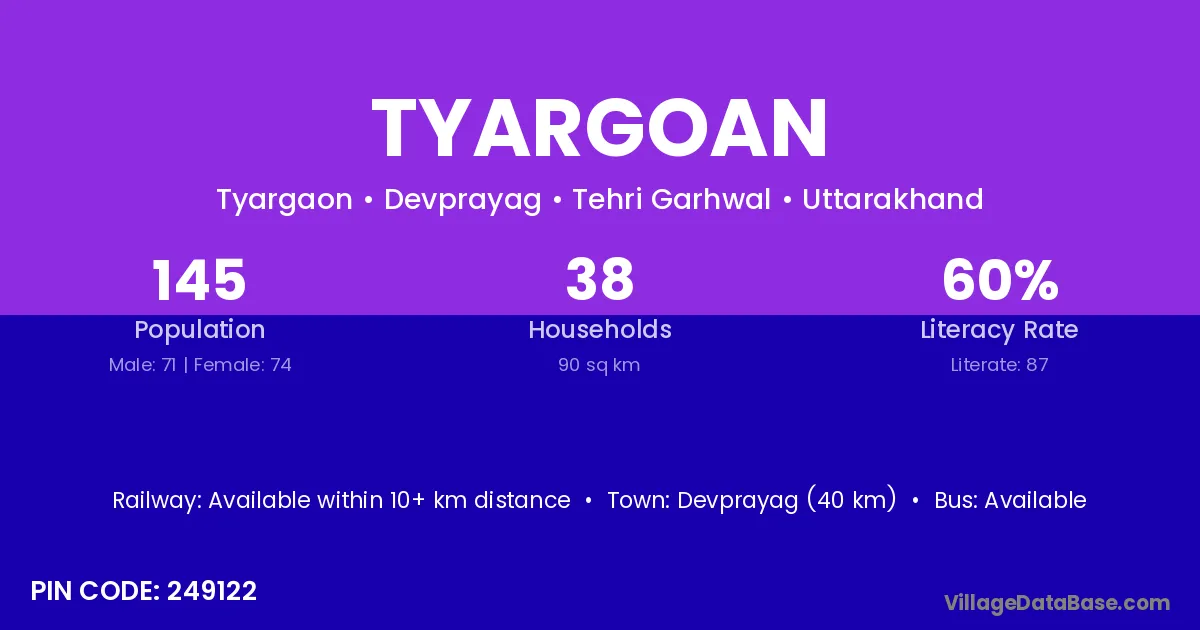 Devprayag (40 km) is the nearest town to Tyargoan village for major economic activities and is located approximately 40 km away.