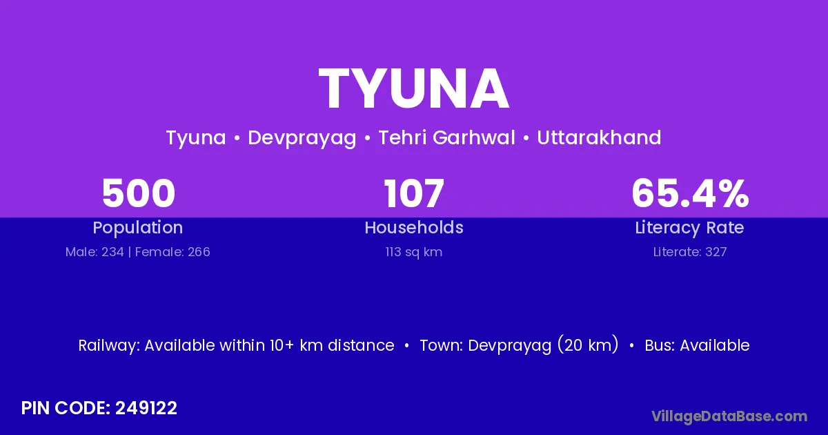 Devprayag (20 km) is the nearest town to Tyuna village for major economic activities and is located approximately 20 km away.