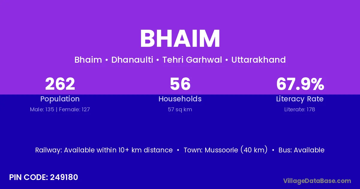 Mussoorie (40 km) is the nearest town to Bhaim village for major economic activities and is located approximately 40 km away.