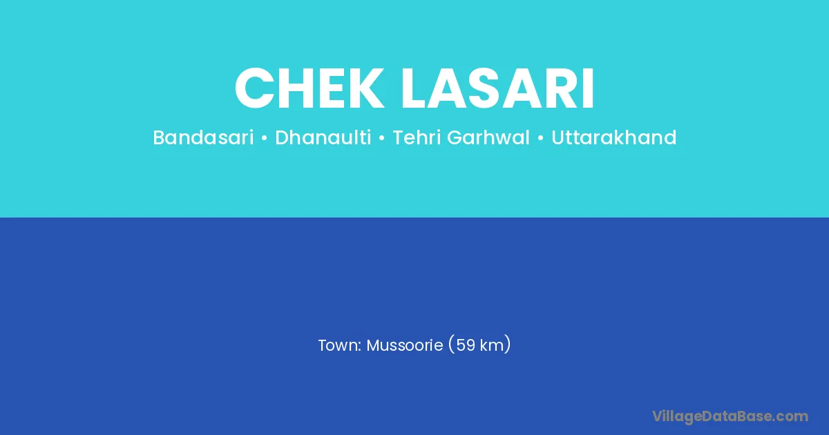 Mussoorie (59 km) is the nearest town to Chek Lasari village for major economic activities and is located approximately 59 km away.