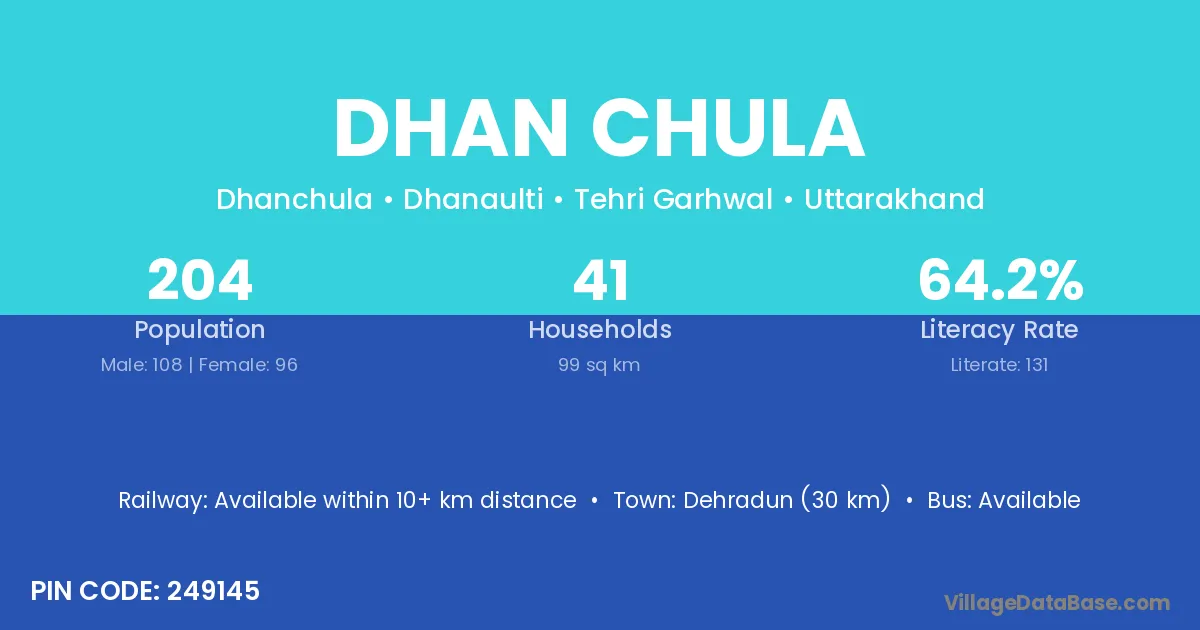 Dehradun (30 km) is the nearest town to Dhan Chula village for major economic activities and is located approximately 30 km away.