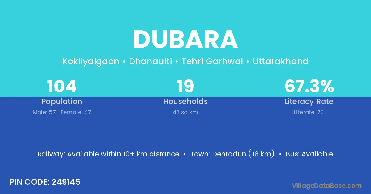 Dehradun (16 km) is the nearest town to Dubara village for major economic activities and is located approximately 16 km away.