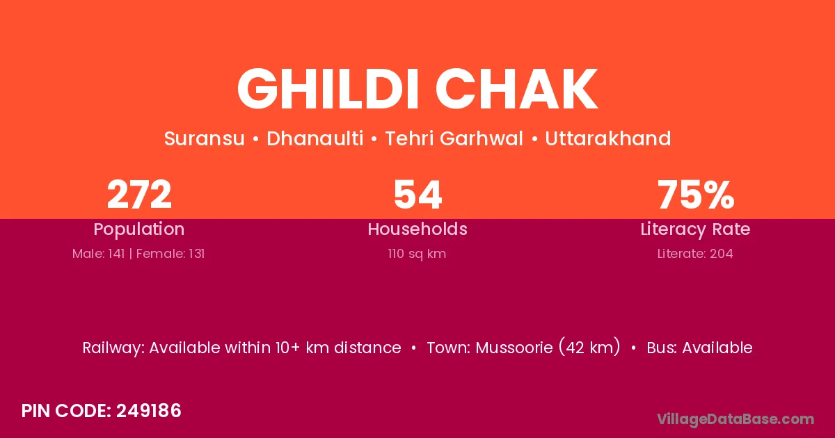Mussoorie (42 km) is the nearest town to Ghildi Chak village for major economic activities and is located approximately 42 km away.