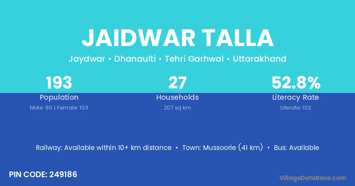Mussoorie (41 km) is the nearest town to Jaidwar Talla village for major economic activities and is located approximately 41 km away.