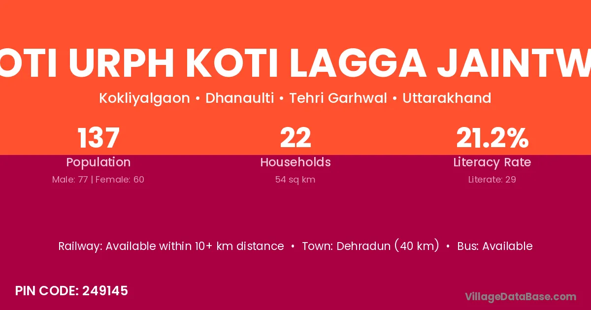Dehradun (40 km) is the nearest town to Jhoti Urph Koti Lagga Jaintwar village for major economic activities and is located approximately 40 km away.