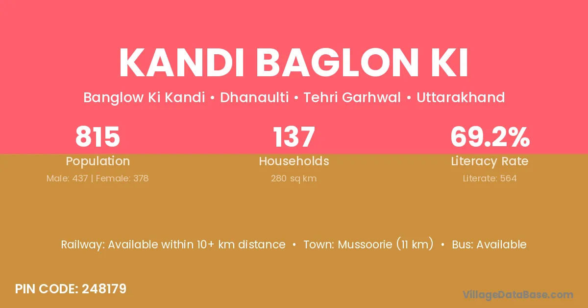 Mussoorie (11 km) is the nearest town to Kandi Baglon Ki village for major economic activities and is located approximately 11 km away.
