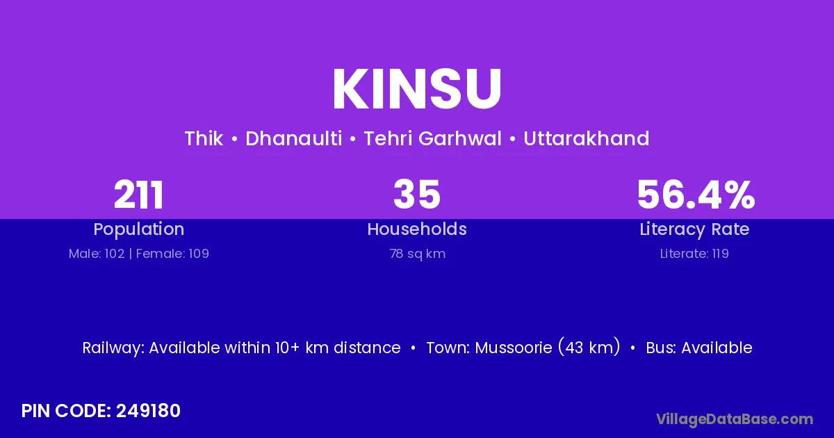 Mussoorie (43 km) is the nearest town to Kinsu village for major economic activities and is located approximately 43 km away.