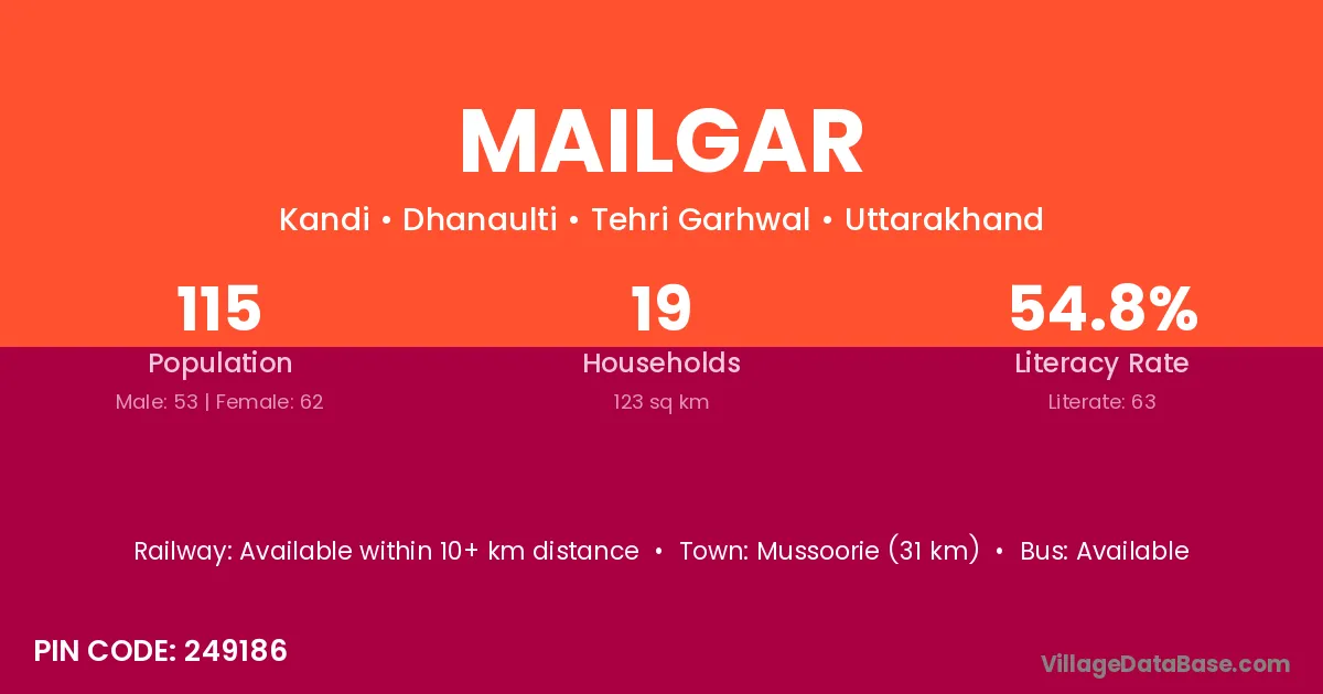 Mailgar village has a total population of 115 people, of which 53 are males and 62 are females.