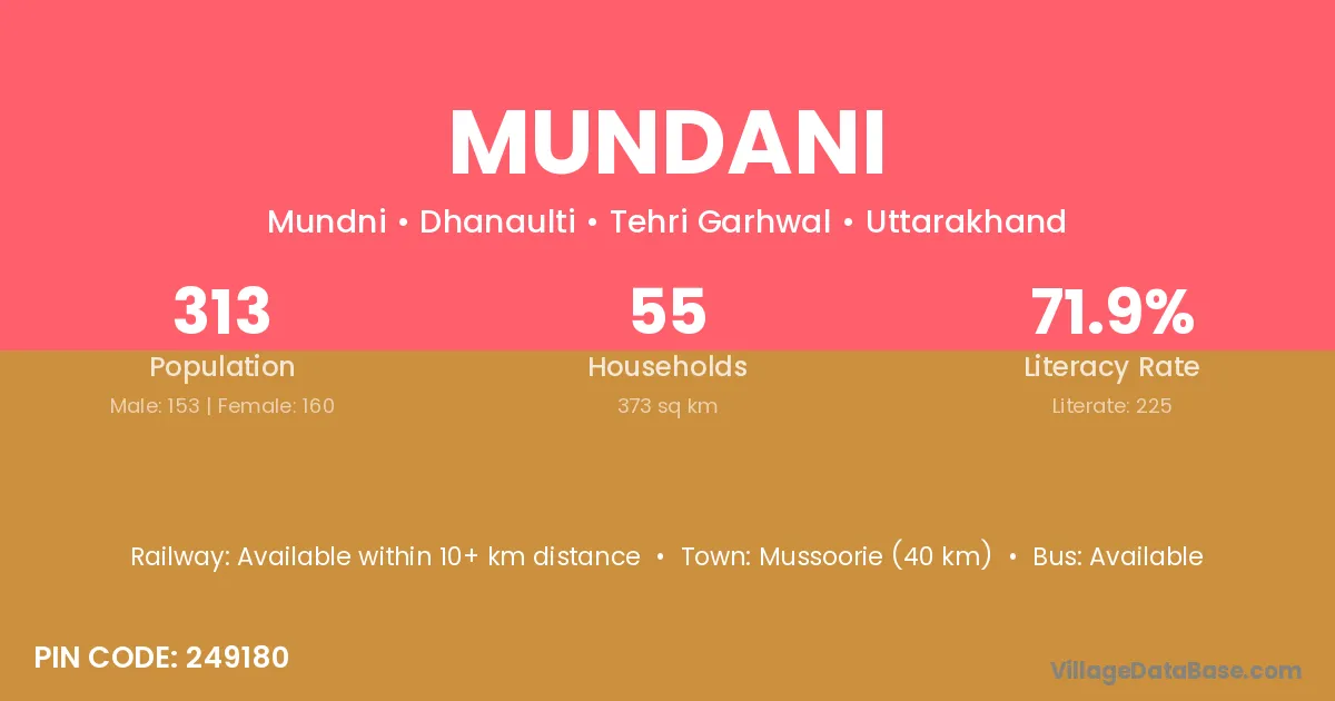 Mussoorie (40 km) is the nearest town to Mundani village for major economic activities and is located approximately 40 km away.