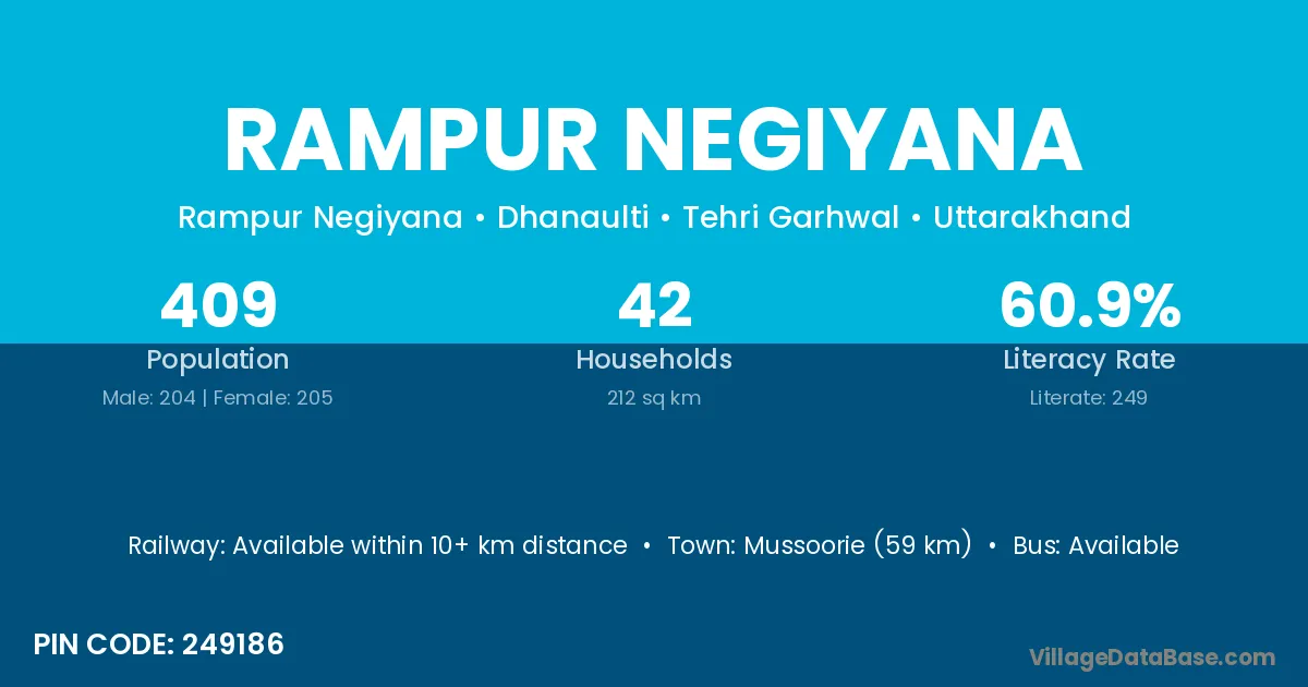 Mussoorie (59 km) is the nearest town to Rampur Negiyana village for major economic activities and is located approximately 59 km away.