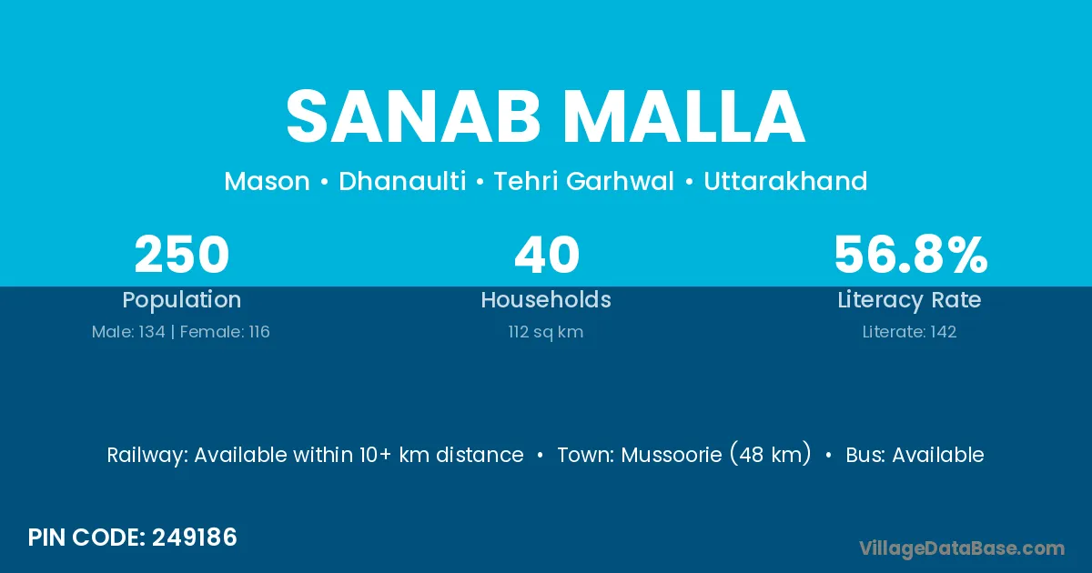 Mussoorie (48 km) is the nearest town to Sanab Malla village for major economic activities and is located approximately 48 km away.