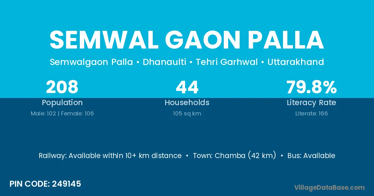 Semwal Gaon Palla village has a total population of 208 people, of which 102 are males and 106 are females.