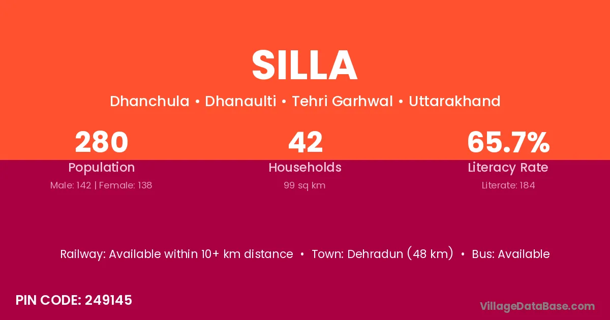 Dehradun (48 km) is the nearest town to Silla village for major economic activities and is located approximately 48 km away.