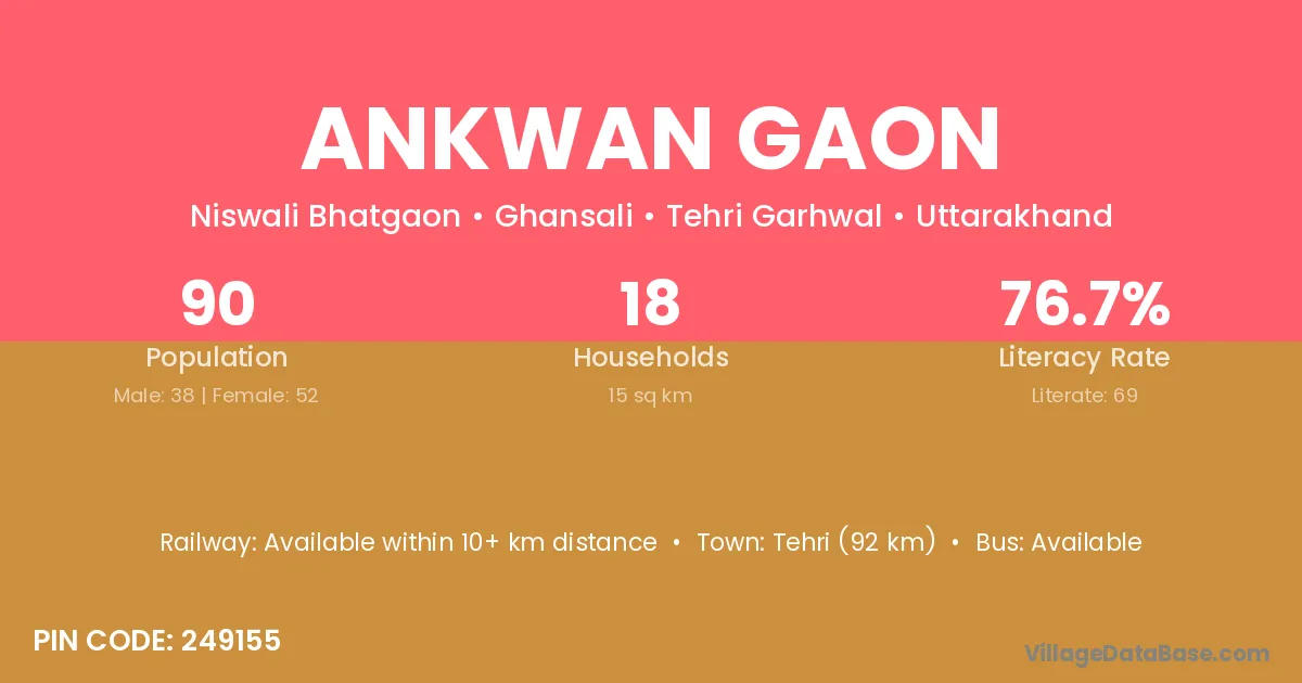 Tehri (92 km) is the nearest town to Ankwan Gaon village for major economic activities and is located approximately 92 km away.